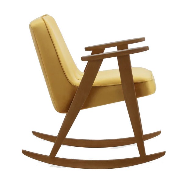 Discover the 366 Rocking Armchair , a version inspired by the famous 366 Armchair designed by Józef Chierowski . With its retro design and small dimensions, it fits perfectly into retro-style interiors and is suitable for small spaces. The 366 Series offers a complete range including sofas, coffee tables and more, all designed in a contemporary style while preserving the essence of the original. Treat yourself to comfort and elegance with the 366 rocking chair in mustard velvet fabric .