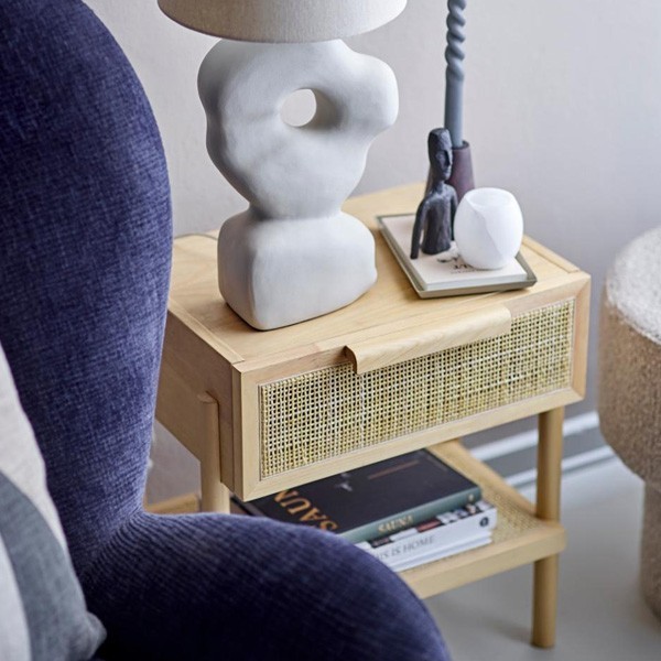 The Manon side table from Bloomingville is a beautiful table with a practical drawer. It is made in a beautiful combination of pine, rattan, and veneer for the covering. It has beautiful rattan details on the front. It is a very versatile table, which is perfect as a bedside table.