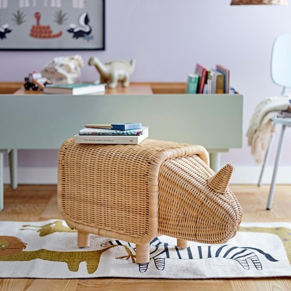 Imagine a warm, light-filled child's room where the natural rattan of the Soffe stool blends harmoniously into a Scandinavian decor. Your child can sit on their little rhino to read a book, then store their favorite toys under the animal's playful tail. This piece of furniture quickly becomes an everyday companion, serving as a seat, chest, and decorative element all in one. Also ideal for a reading corner or a bohemian chic living room!