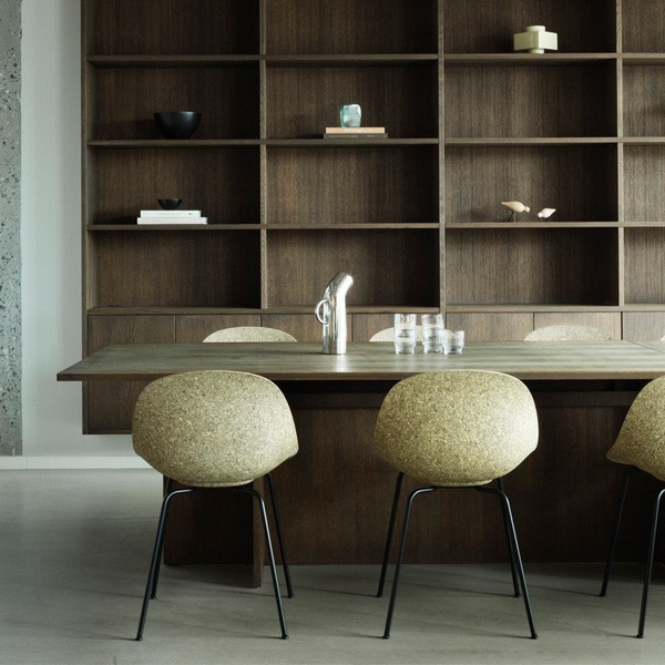 The Mat chair is made in Denmark and designed by Foersom & Hiort-Lorenzen. It consists of a hemp shell made using a unique compression process, mounted on powder-coated steel legs. The shell is made from a proprietary blend of 75% hemp fibres, while the remaining 25% is made from a specially developed and recyclable bico binder. The Seaweed variant is made from 69% hemp fibres, 6% eelgrass (seaweed) and 25% binder. At the end of their lifespan, both the shell and the base can be recycled if returned to Normann Copenhagen.