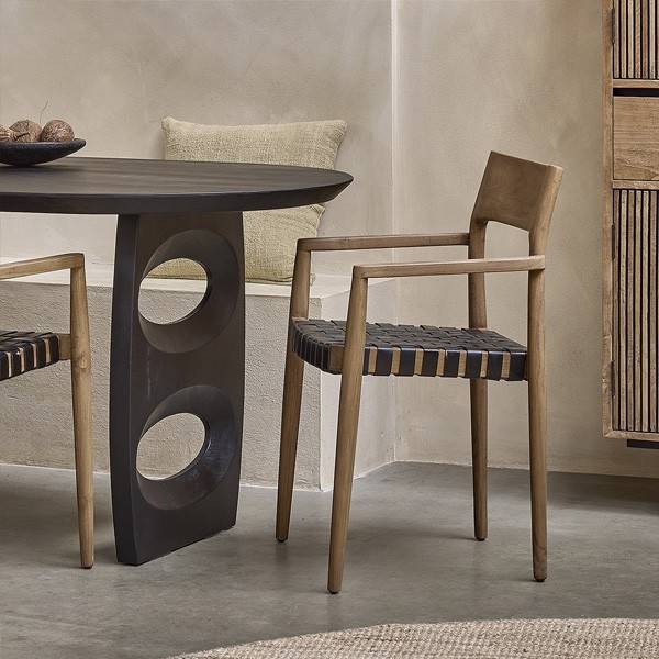 In a modern and bright dining room, a light wood table with a clean design is surrounded by chairs from the Freya collection. Each chair, with its teak frame and black leather seat, offers optimal comfort while adding a touch of sophistication to the space. A few chairs are also covered in natural leather, creating a nice contrast that reinforces the elegance of the room.