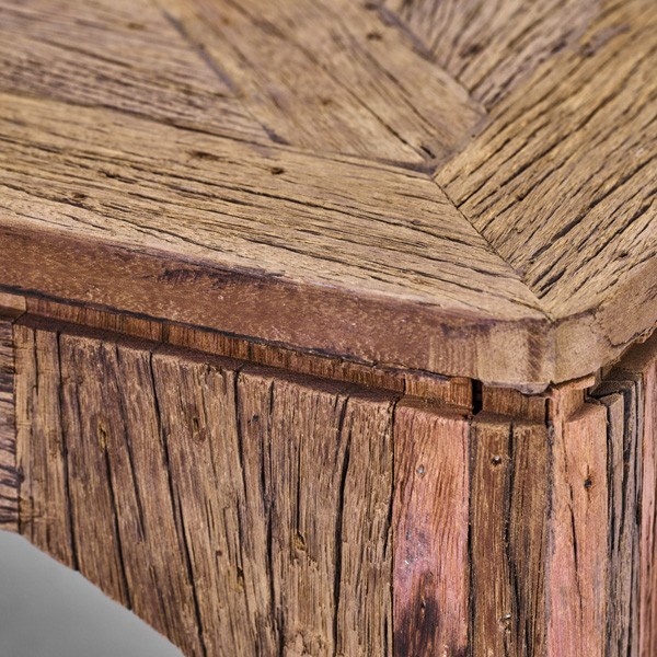 Imagine this piece of furniture placed in the center of your living room, immediately attracting attention with its elegant design and rustic texture. The recycled wood top, with its panels assembled in a unique pattern, stands out for its warmth and authenticity, creating a welcoming atmosphere. Its square shape fits perfectly into a modern or more traditional space, adding a touch of character without overloading the space.