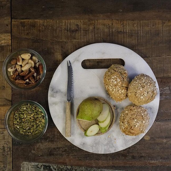 In a bright, contemporary kitchen with white walls and light wood accents, the Trademark Living Round Marble Chopping Board sits elegantly on the countertop. Its smooth, glossy surface reflects the light, highlighting the subtle veins that run through the marble. A chef prepares fresh vegetables for a salad, using the board as a practical and aesthetic workspace. Next to it, some cheeses and fruits are beautifully arranged on the board, ready to be served at a convivial dinner party. With its timeless design and natural materials, the board becomes a real focal point of the kitchen, combining functionality and beauty.