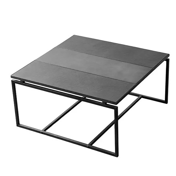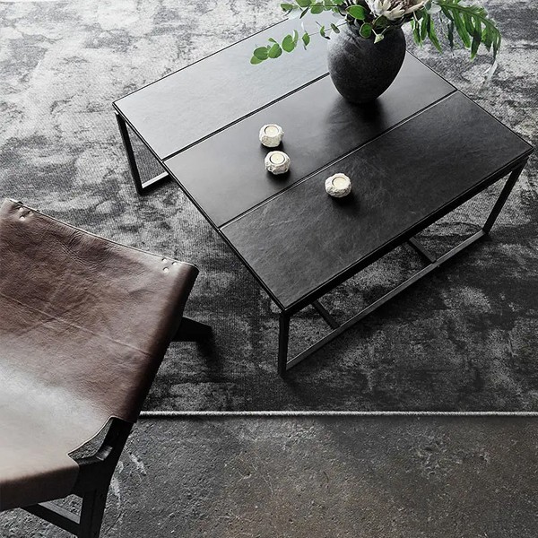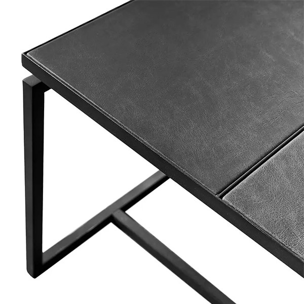The square Austin coffee table is designed with well-defined lines and angles and its style is recognizable and minimalist . The Austin collection has a light and elegant design expression that adds a sculptural touch to the room. The table is made from a metal base which is powder coated. The top is made of metal panels and black leather , which can be placed differently to create a personal expression.