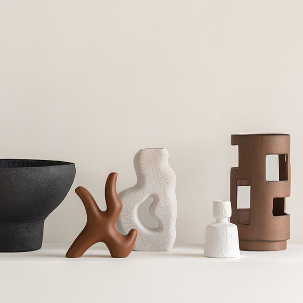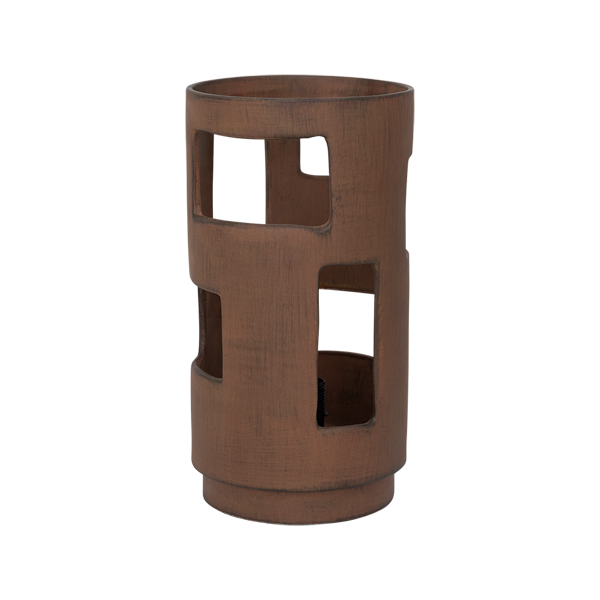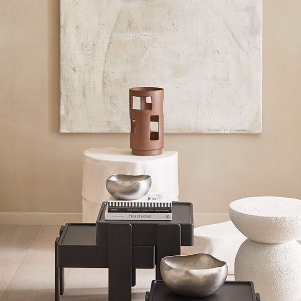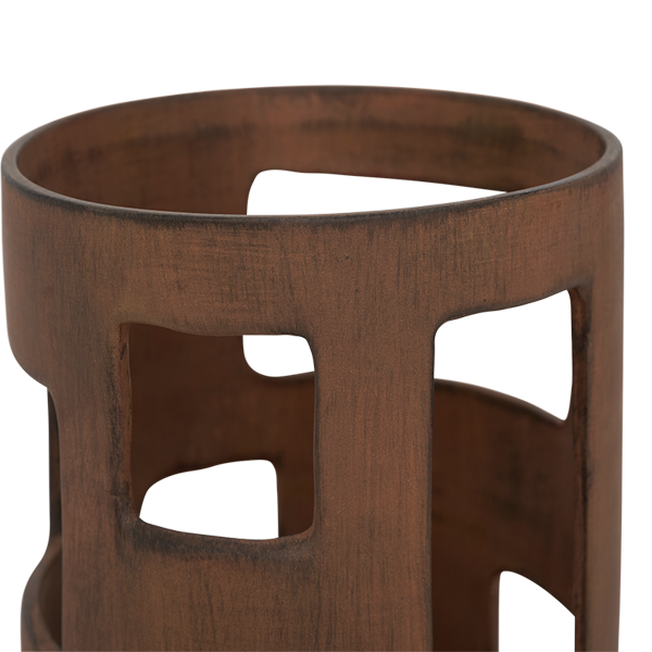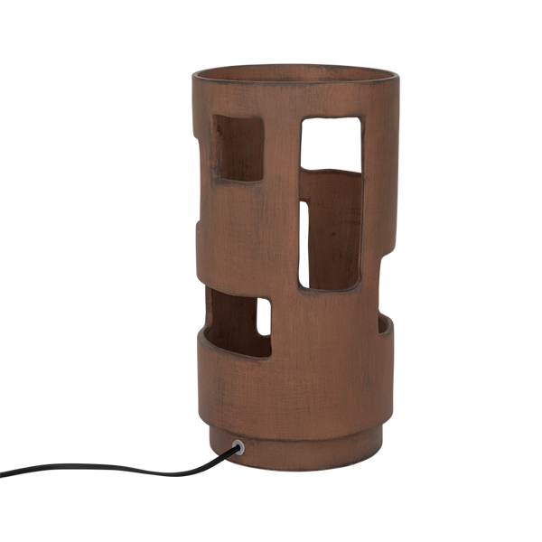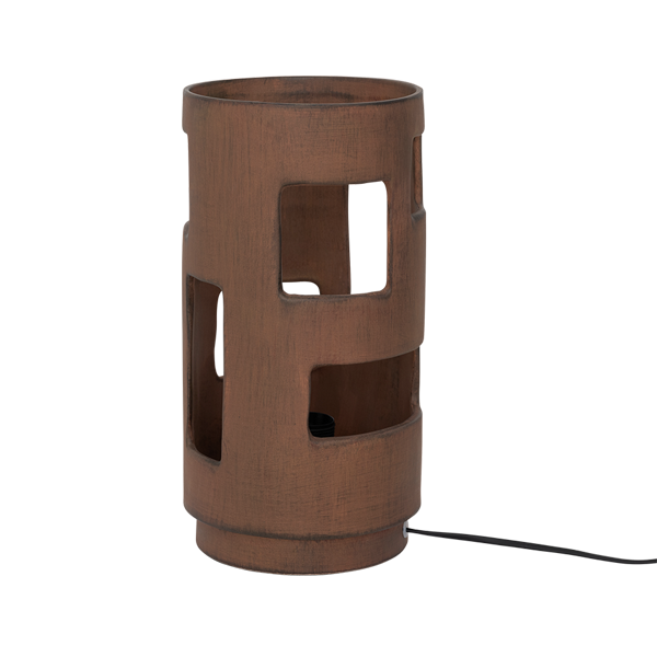 Picture yourself in a sleek, contemporary space, where every decorative element tells a unique story. The evening light begins to filter through the room, creating a warm and soothing atmosphere. At the corner of a beautifully arranged table, the Angoli lamp stands like a light sculpture. Rays of light stream through the carefully arranged openings, casting captivating patterns on the surrounding walls. The combination of delicate ceramic and the robust corten steel- coloured finish adds a tactile dimension to this functional piece of art.