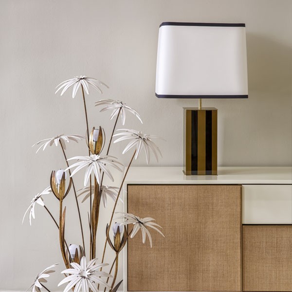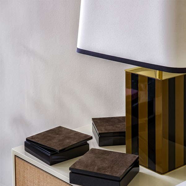 Brass and two-tone black and mustard lacquer combine perfectly and make this table lamp majestic and refined. The stripes on the foot are echoed on the black-edged lampshade: the optical effect is perfect and this is where the dandy spirit enters the Élysée.