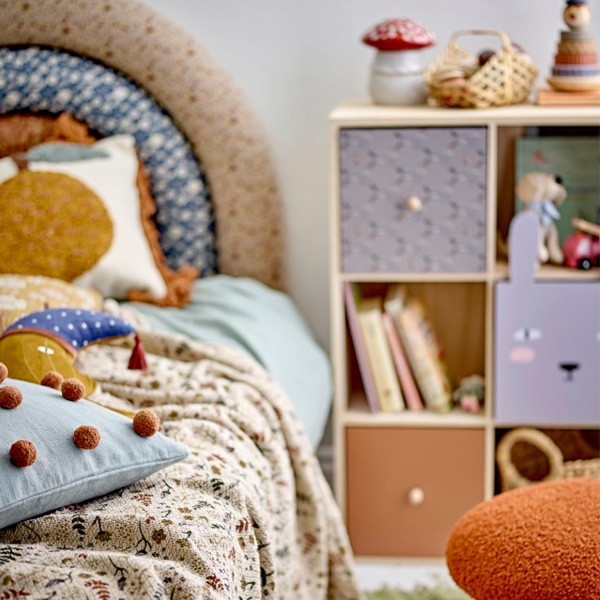 Imagine a child's room bathed in natural light, where an atmosphere of comfort and creativity reigns. In the corner of the room, the Calle bookcase by Bloomingville MINI reigns, a centerpiece that is both aesthetic and functional. Made of natural paulownia, its warm tones blend harmoniously into the space.