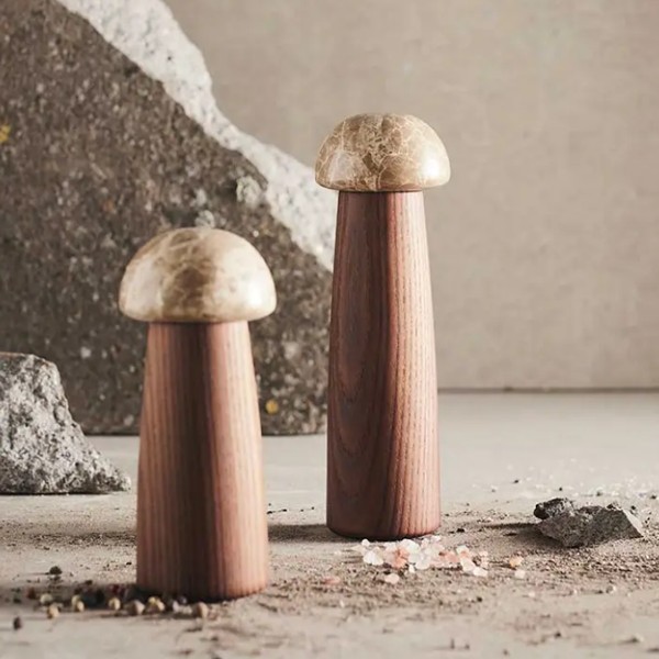 The Yami series salt mill is crafted from charred ash wood and features a ceramic grinder. This wood material creates the iconic dark color that characterizes the Yami series. The light marble provides a beautiful contrast to the dark wood, adding a distinctive touch to the design.