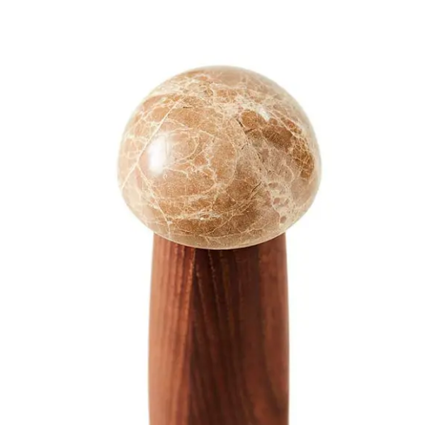 The Yami series salt mill is crafted from charred ash wood and features a ceramic grinder. This wood material creates the iconic dark color that characterizes the Yami series. The light marble provides a beautiful contrast to the dark wood, adding a distinctive touch to the design.