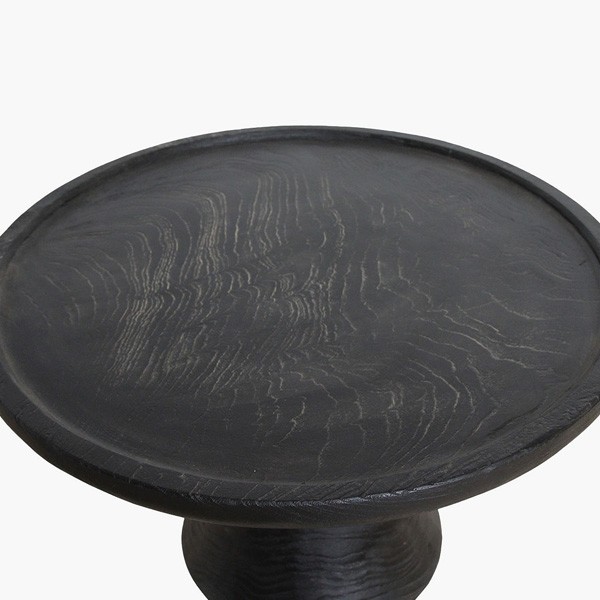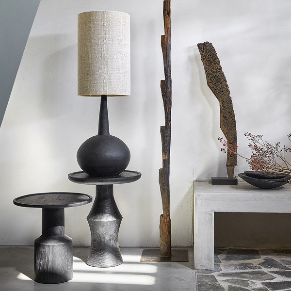 In a modern living room with neutral tones, the Nero Twilight side table stands out with its elegant and deep finish. Placed next to a light grey linen sofa, it creates a nice contrast while adding a touch of discreet sophistication. A small ceramic vase and a lamp with a minimalist design rest on its top, delicately illuminating the space and highlighting the texture of the wood. When combined with a lower table from the same collection, the set offers a harmonious play of heights, giving the room an elegant and balanced dimension. Whether as a single element or in a combination, the Nero Twilight table enriches the atmosphere of the living room, creating an atmosphere that is both modern and warm.