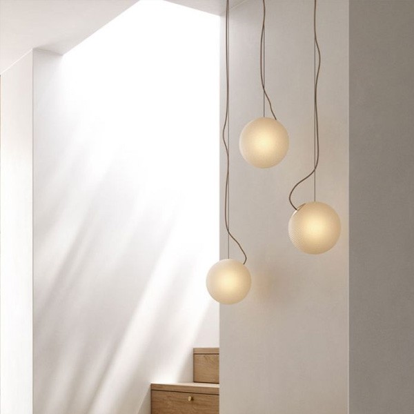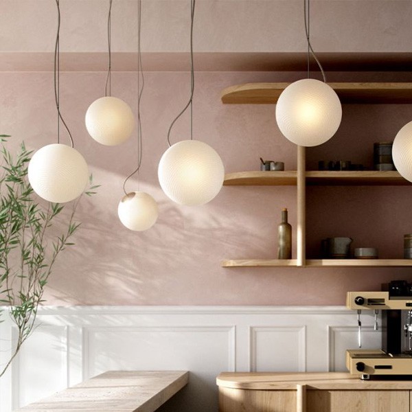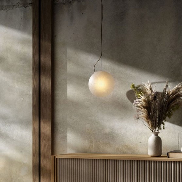 Imagine you're in an elegantly decorated living room, where every detail has been carefully chosen. In the corner, you notice a coffee table made of fine wood and a pair of comfortable armchairs. Above the table, suspended gracefully, is the Bright Ripple lamp. Soft, warm light emanates from its hand-blown glass shade, creating a soothing ambiance in the room.