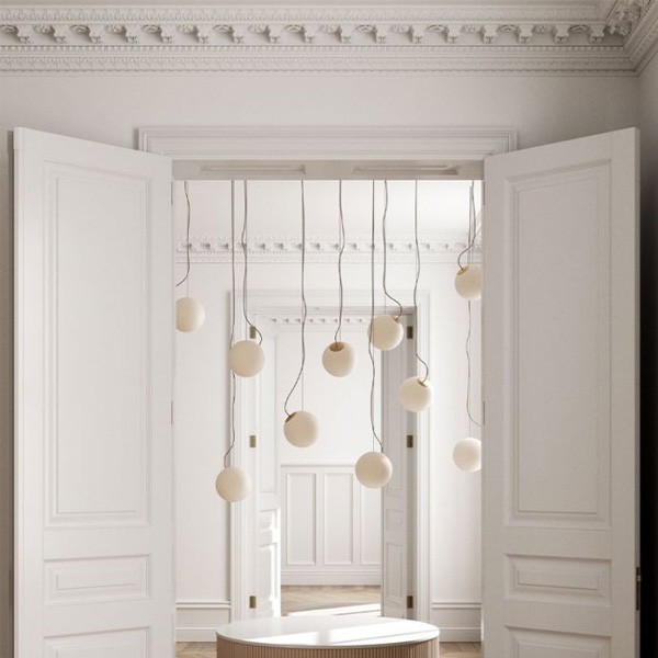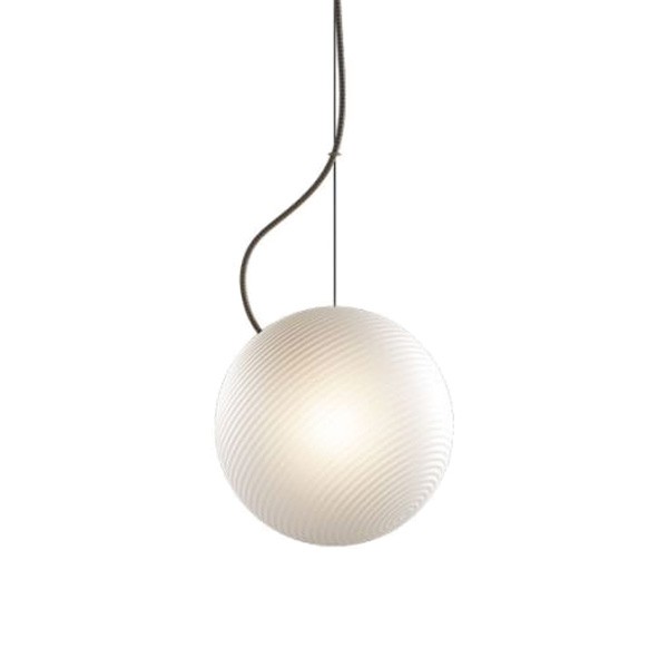 Bright Ripple , a captivating lamp design, is inspired by the capillary waves that form on the surface of a liquid when it is disturbed. This distinctive pattern illustrates the relationship between cause and effect, reflecting the interconnectedness of all natural phenomena. Shaped according to a mathematical pattern, this mouth-blown glass lamp embodies the ripple effect on a spherical shape, evoking a miniature planet. In aesthetic contrast to the Barroco lamp, Bright Ripple explores rhythm, pattern and draws inspiration from Fibonacci numbers. Both projects, rooted in nature, offer a poetic aesthetic, each with its own unique beauty. With its solid brass cover, Bright Ripple is a striking example of classical aesthetics, completing the full spectrum with Bright Barocco, which embodies the Baroque style.