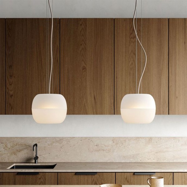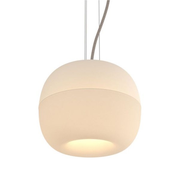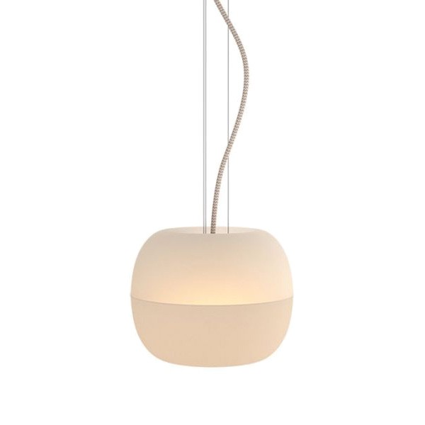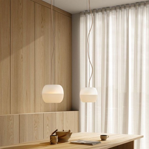 The resemblance to an apple is found not only in the beautiful outline of this lamp, shaped by mouth-blown glass, but also in the delicate swinging of its cord, which mimics a natural stem. Just as an apple draws its nutrients through its stem, Bright Malus is illuminated by its own. This luminaire is made up of two blown glass shells, one opaque and the other diffused, which offer three different types of light. A light directed towards the table for optimal color rendering, a diffused upward light which avoids glare, and a semi-diffuse light to attenuate strong shadows between the directed light and its environment.