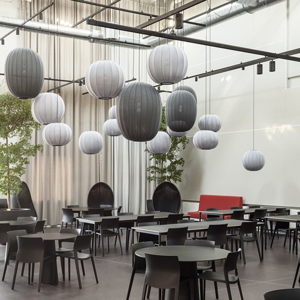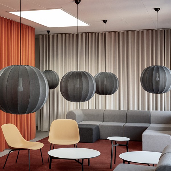 Its shade is crafted from a knitted material that filters light through its thread pattern, creating a distinctive and decorative expression. Although the knitting technique dates back centuries, it allows complex shapes to be created without the need for additional stitching or joining.