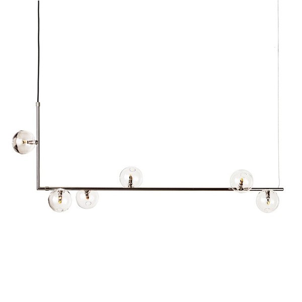 The six G4 LED bulbs, supplied with a maximum power of 10W, deliver a warm white colour (3000K) and are dimmable to adjust the lighting ambiance according to your preferences. Measuring 73 cm in length, 25 cm in height and 7 cm in depth, this pendant light is also available in an elegant nickel finish, offering options to suit your aesthetic tastes.