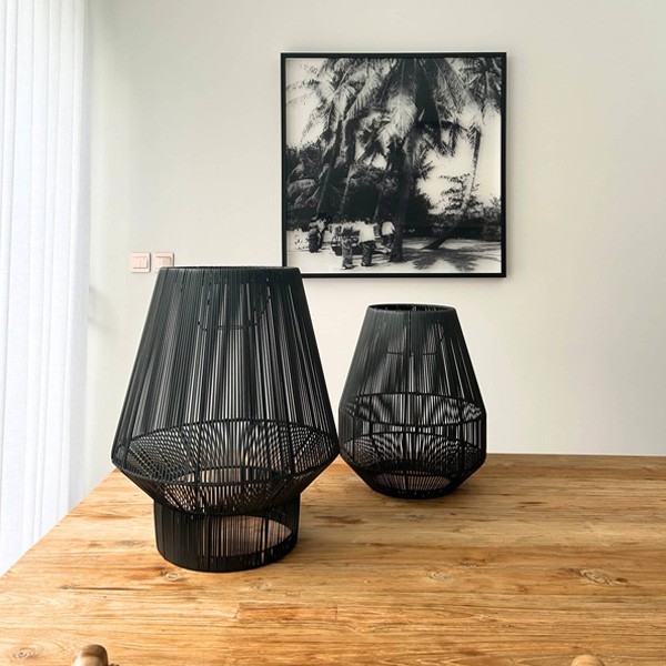 In a large living room or dining room, the Recycled Lantern No. 1 – Size L – Anthracite Black becomes a focal point, suspended above a large table or placed on a piece of furniture, adding depth and light. Outdoors, it creates a modern and warm atmosphere on a terrace or garden. Its anthracite shade blends harmoniously with contemporary and natural materials, while supporting an ecological project thanks to its manufacture in recycled plastic from the Indonesian coast.