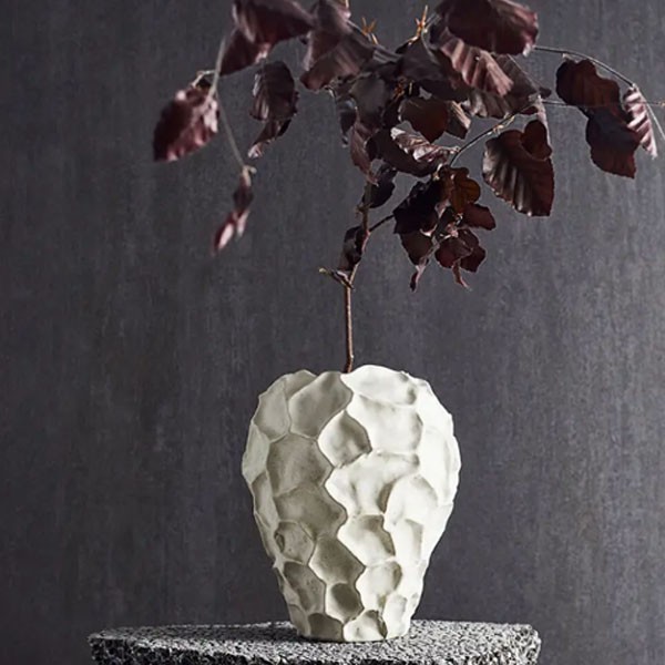 The collection Soil is inspired by the patterns and textures of nature. With a delicious icing vanilla, the mysterious forms of vase in sandstone bring thoughts of nature's blessings to life. Combined with fresh flowers or dried decoration, the Soil vase looks stunning both in a natural setting with furniture in wood and a modern frame in an iron cabinet. Use the vase alone to really appreciate the sculptural design.