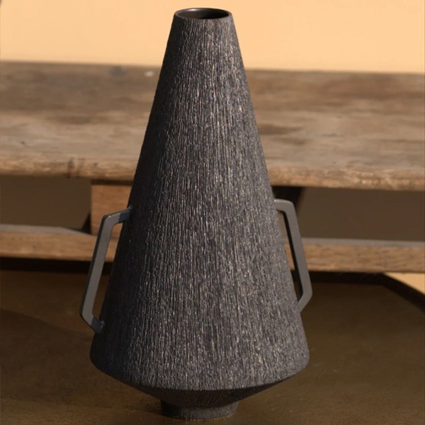 On a light wood table, a stone console, or a minimalist shelf, the Graphite vase draws the eye without ever being imposing. Its dark surface captures the light, retains it, and reflects it in subtle nuances, like a silent echo of the mineral world that inspired it. In a contemporary or more rustic interior, it becomes the point of equilibrium: between shadow and light, strength and delicacy.
