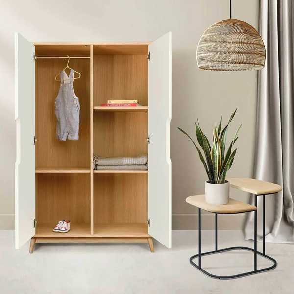 Its sturdy structure made of solid wood, sourced from sustainably managed European forests, ensures exceptional durability. The flared legs add a touch of modernity, while the soft-closing doors provide a smooth user experience, accentuating the wardrobe's elegance.