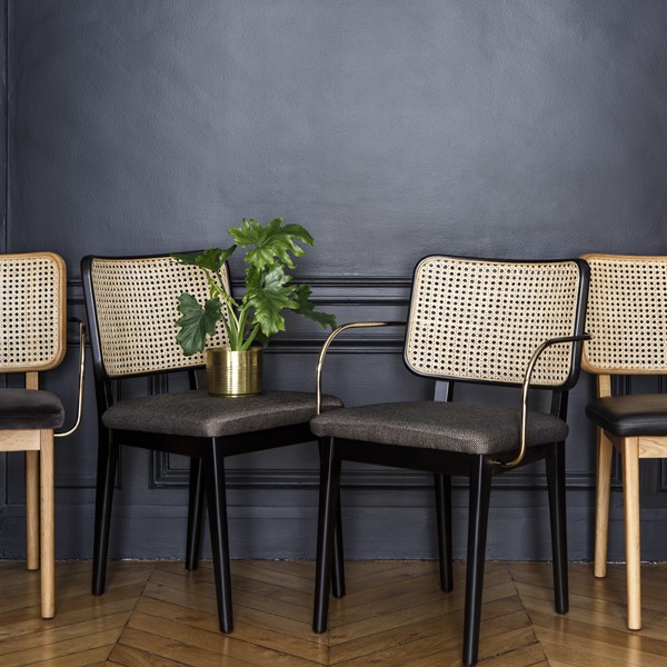 La chaise en cannage de la collection Red Edition est composée d'une structure est réalisée en chêne noir et d'accoudoirs en laiton. L'assise est confortable en mousse est recouverte de tissu gris caviar. Cette très jolie chaise droite au confort absolu est inspirée des brasseries parisiennes. Le mélange des matières est très réussi et en fait une pièce d'exception