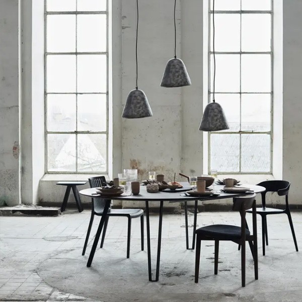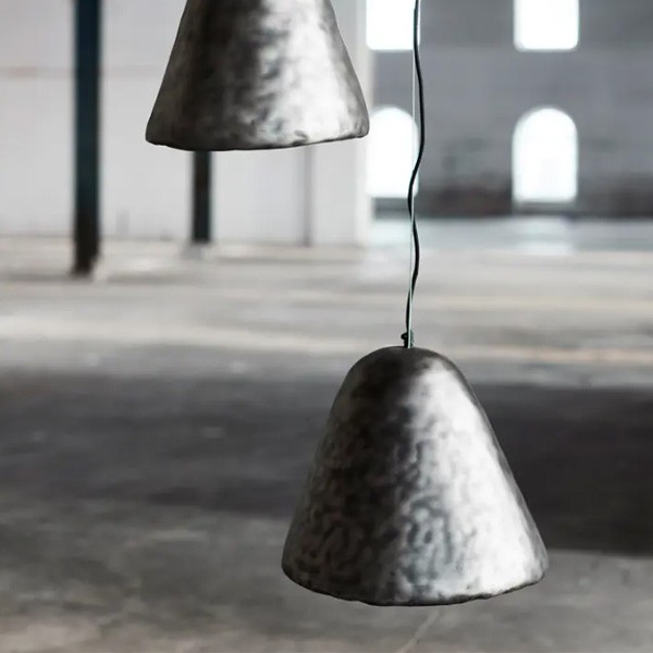 Hima est une suspension rustique et asymétrique en acier, conçue avec une surface martelée et brute qui évoque les halls industriels d'autrefois. La belle couleur grise est patinée, créant des références et des récits remontant à l'ère industrielle. Hima est coulée dans un moule et possède un bord en acier courbé, ce qui lui confère une finition douce qui contraste magnifiquement avec son apparence industrielle.
