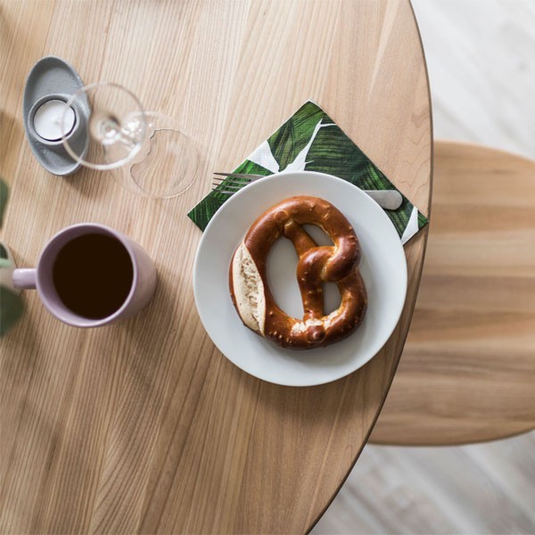 La table Naïve de chez EMKO a une forme modeste et nette, Avec un diamètre de 110 cm, sa conception est à la fois simple et robuste. Chaque pied a sa propre base sous le plateau de la table, ce qui la rendre solide et même prête à servir les générations futures. Le contour de ce meuble tout en rondeur crée une atmosphère accueillante et cosy pour les convives mais surtout il apporte une sensation de fluidité dans la circulation de la pièce.